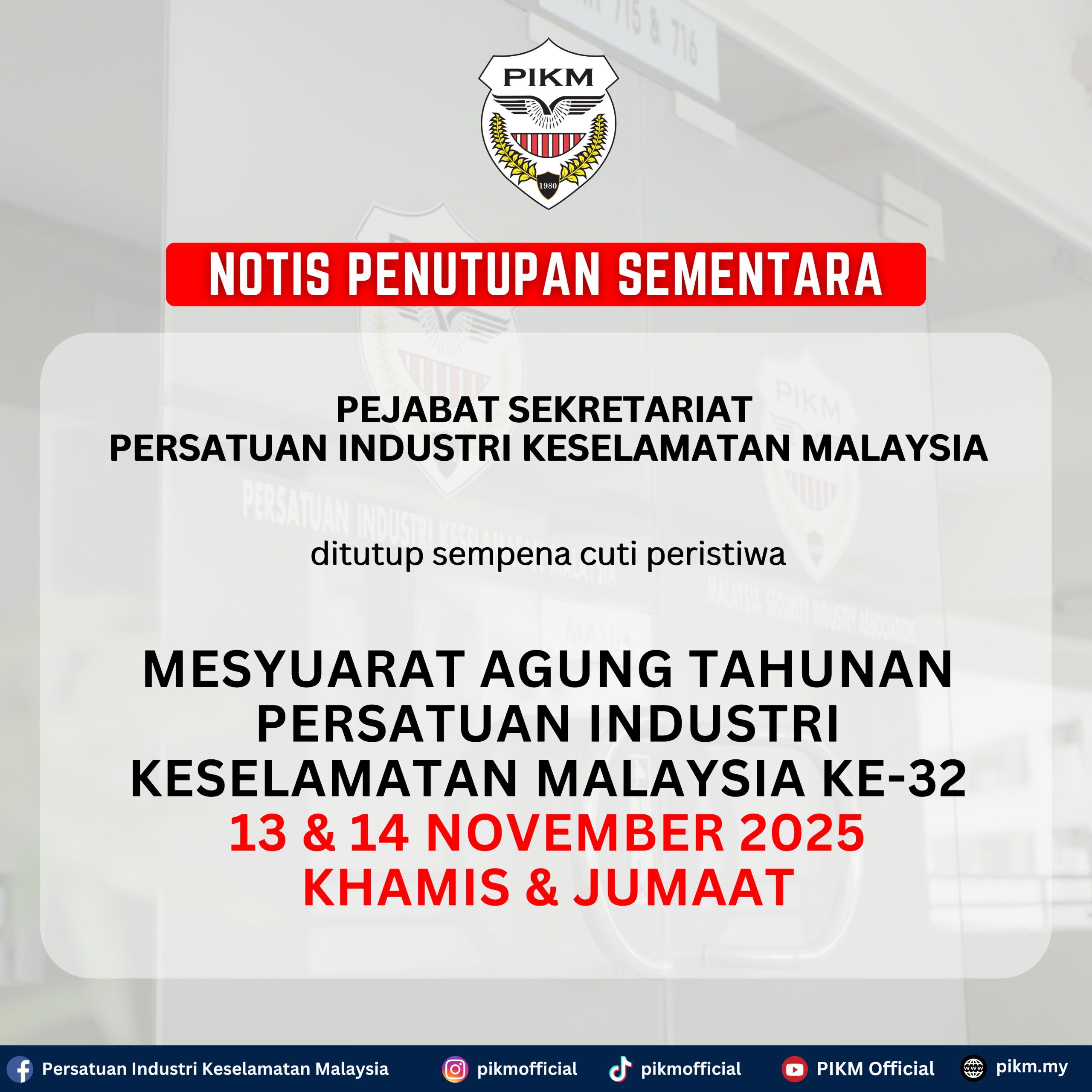 Dimaklumkan bahawa Pejabat Sekretariat Persatuan Industri Keselamatan Malaysia (PIKM) akan ditutup sementara pada 13 & 14 November 2025 (Khamis & Jumaat) sempena Mesyuarat Agung Tahunan PIKM ke-32 yang diadakan di Mövenpick Hotel and Convention Centre.