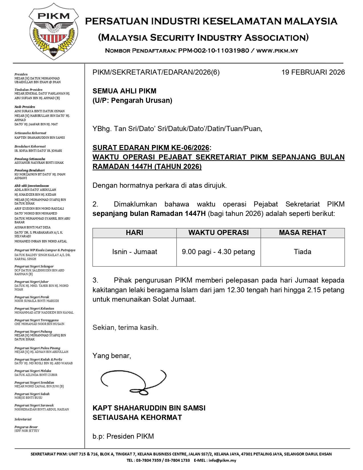 SURAT EDARAN PIKM KE-06/2026: WAKTU OPERASI PEJABAT SEKRETARIAT PIKM SEPANJANG BULAN RAMADAN 1447H (TAHUN 2026)