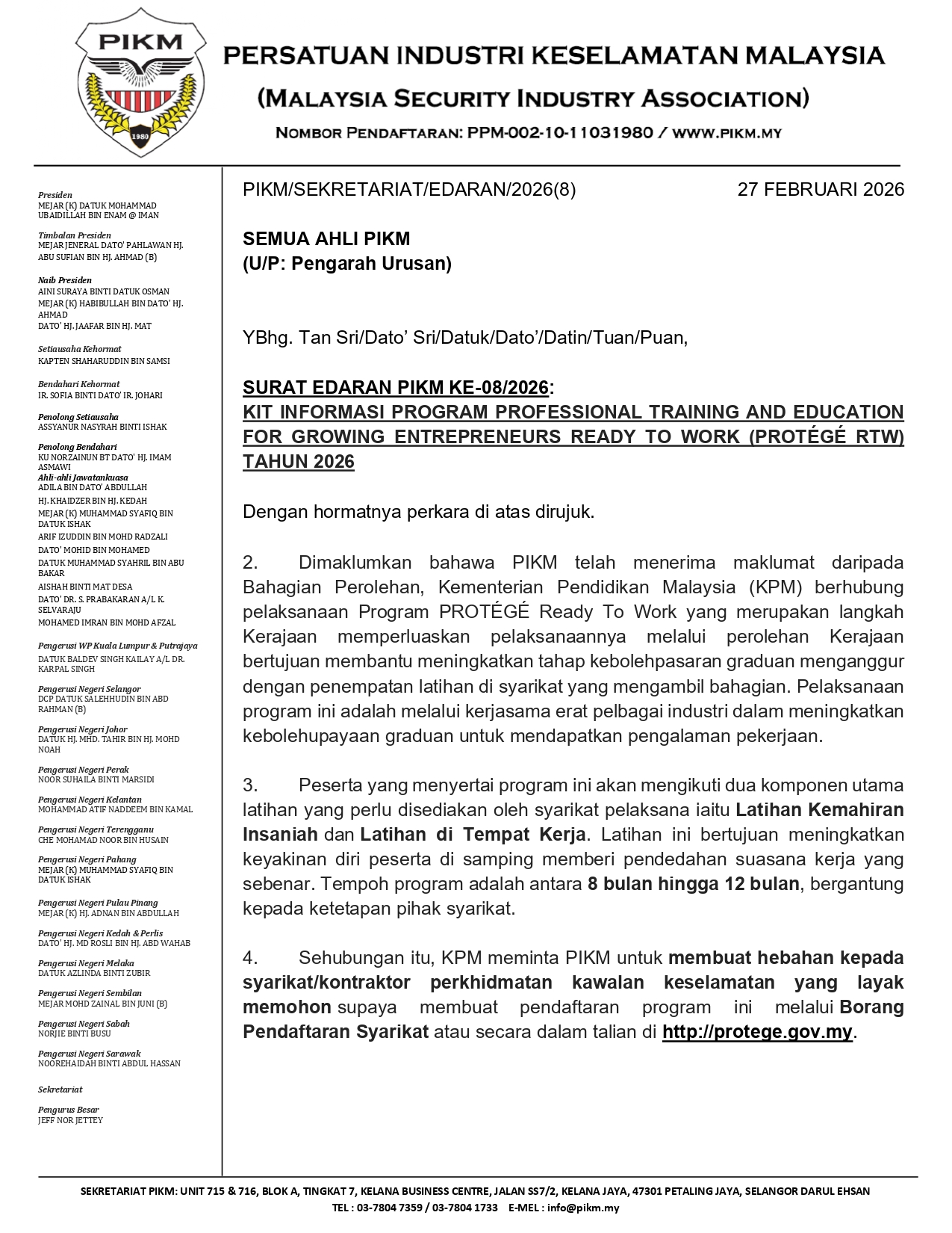 SURAT EDARAN PIKM KE-08/2026: KIT INFORMASI PROGRAM PROFESSIONAL TRAINING AND EDUCATION FOR GROWING ENTREPRENEURS READY TO WORK (PROTÉGÉ RTW) TAHUN 2026