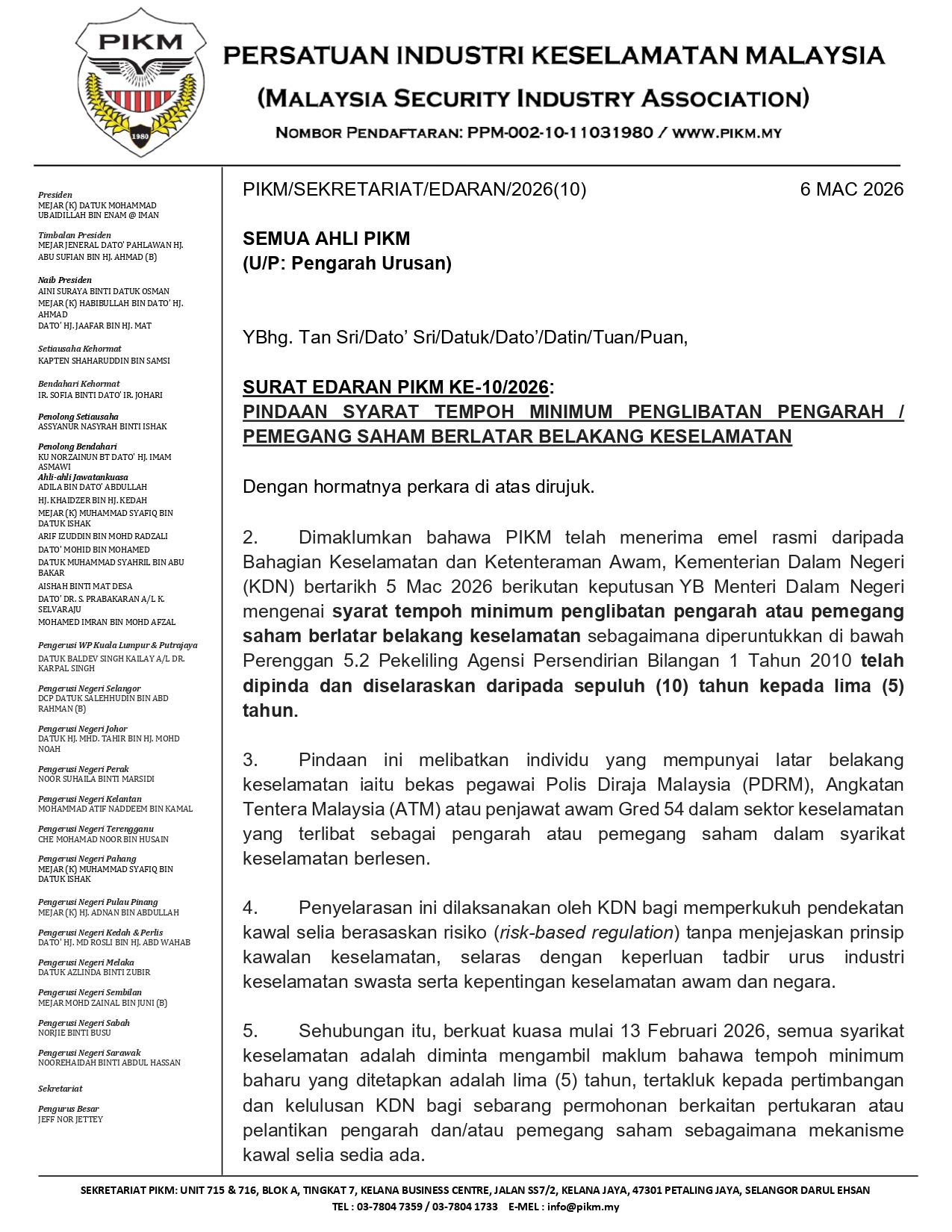SURAT EDARAN PIKM KE-10/2026: PINDAAN SYARAT TEMPOH MINIMUM PENGLIBATAN PENGARAH / PEMEGANG SAHAM BERLATAR BELAKANG KESELAMATAN
