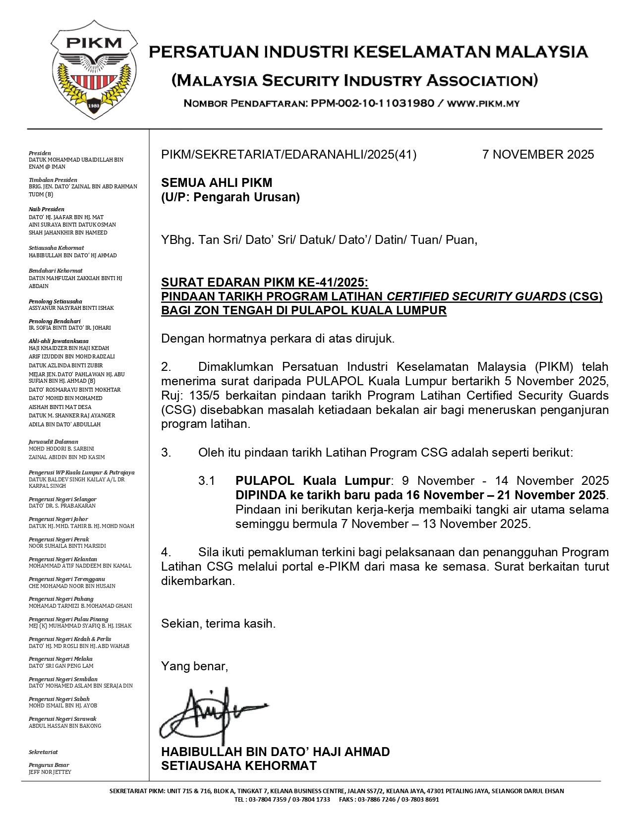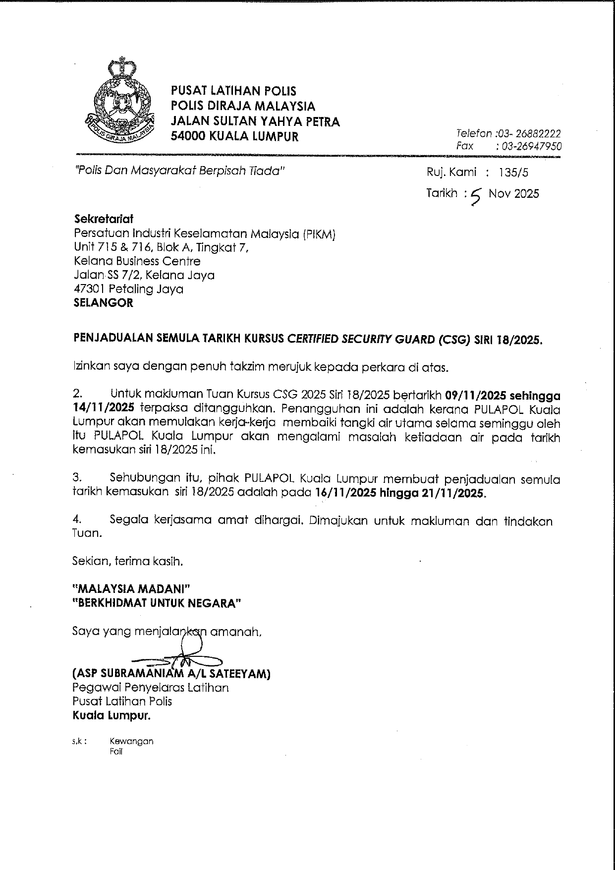 SURAT EDARAN PIKM KE-41/2025: PINDAAN TARIKH PROGRAM LATIHAN CERTIFIED SECURITY GUARDS (CSG) BAGI ZON TENGAH DI PULAPOL KUALA LUMPUR