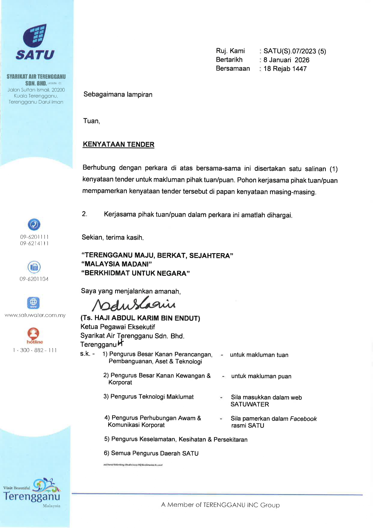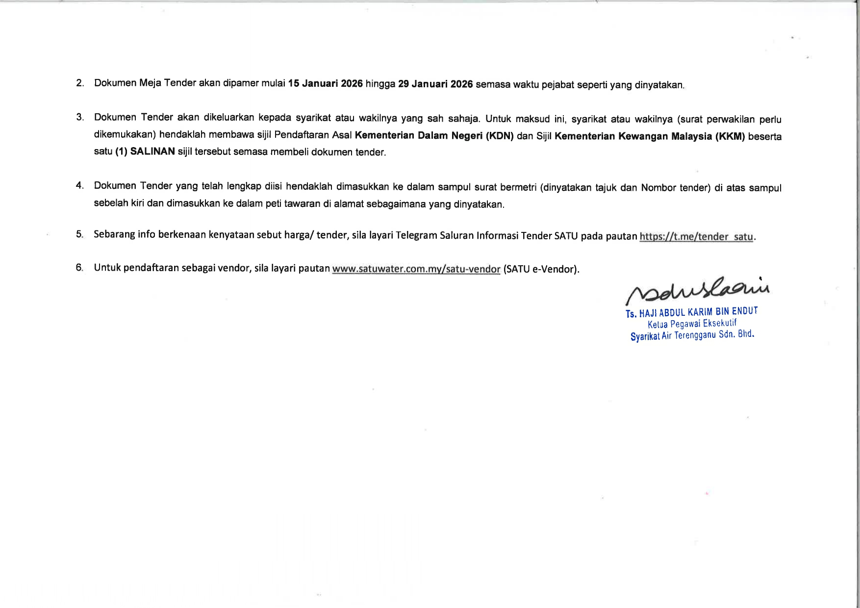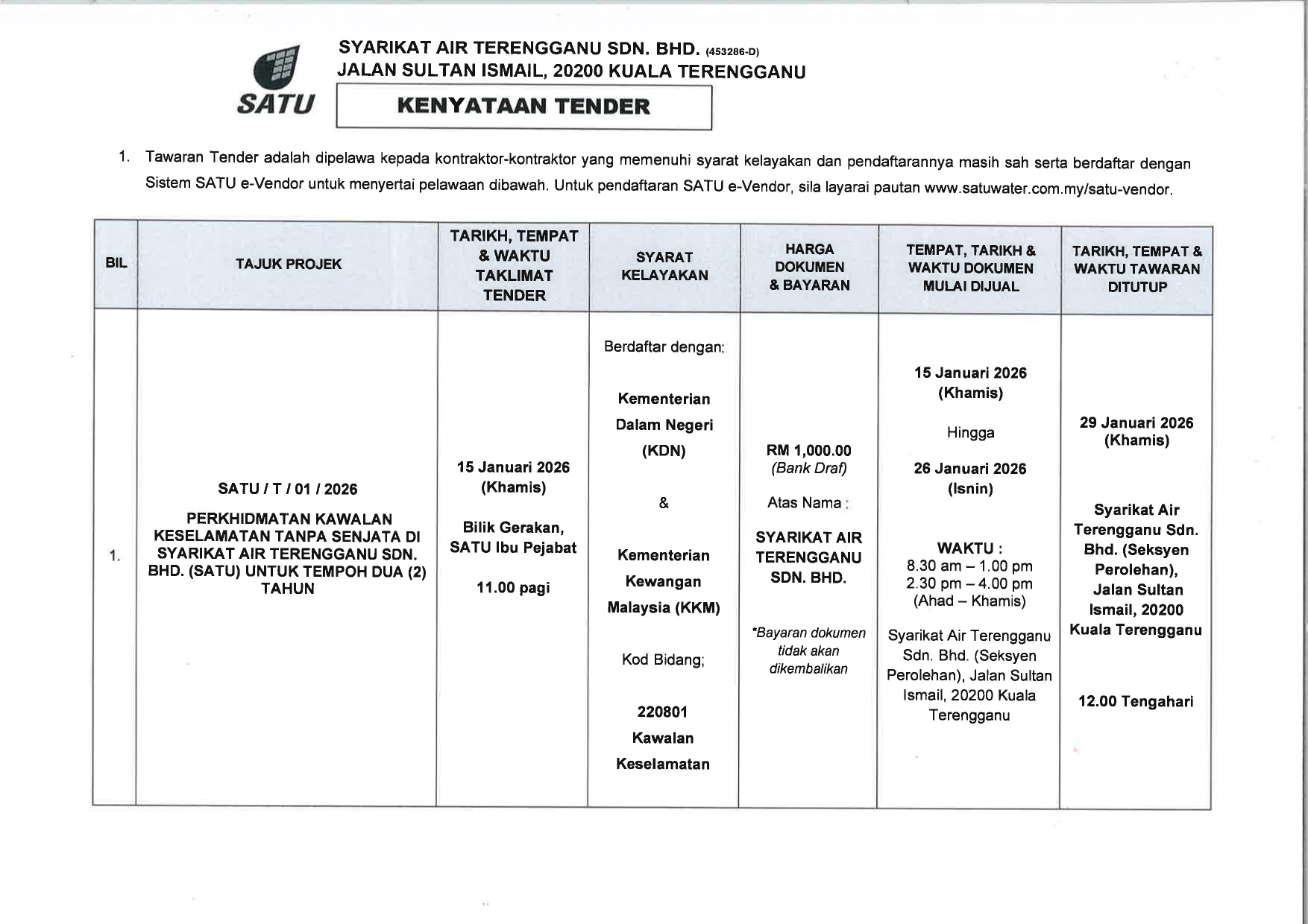 TAWARAN TENDER PERKHIDMATAN KAWALAN KESELAMATAN TANPA SENJATA API DI SYARIKAT AIR TERENGGANU SDN BHD