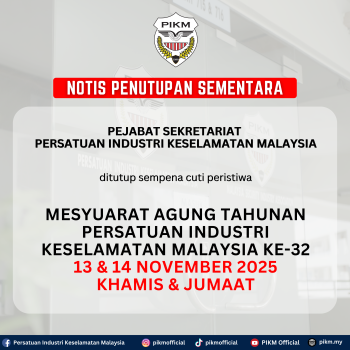 Kepada Ahli-ahli yang dihormati, Dimaklumkan bahawa Pejabat Sekretariat Persatuan Industri Keselamatan Malaysia (PIKM) akan ditutup sementara pada 13 & 14 November 2025 (Khamis & Jumaat) sempena Mesyuarat Agung Tahunan PIKM ke-32 yang diadakan di Mövenpick Hotel and Convention Centre.…